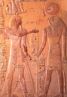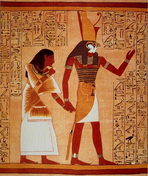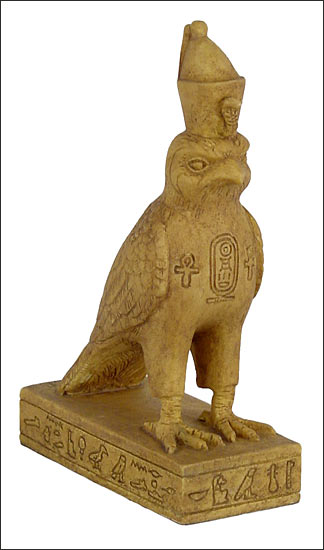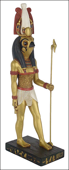 Horus the Elder is a sky god. In some variations of the myth, he is the son of Geb and Nut, making him the brother of Osirus, Set, Isis, and Nepthys. Indeed, in some specific versions of the myth, Horus is Set's twin brother, thus forming a light/dark, day/night dichotomy. Horus the Elder is typically depicted as human with a falcon head. It is said that his right eye was the sun and his left eye was the moon. He once got into a terrible fight with his brother Set, and Set gouged out his left eye. The moon then became the dominion of the god Thoth.