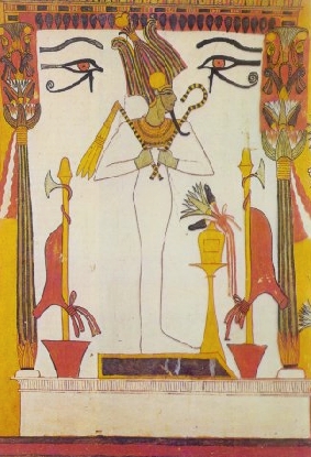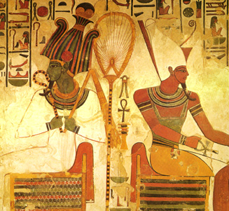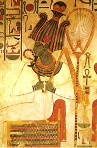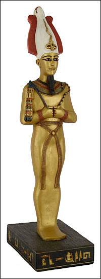 Osirus is the eldest son of Geb and Nut. He is a god of death and rebirth. On the one hand, he is the Lord of the Underworld, where he sits and passes judgment on the souls of the dead. On the other hand, he is responsible for the periodic flooding of the Nile River, and therefore, the fertility of the land. He is typically depicted as a green-faced mummy wearing the atef crown and carrying the crook and flail, all symbols of a ruler. His brother Set is his enemy. His sister Isis is his wife, and they have a child, Horus the Younger, who was conceived magically after Osirus's death.